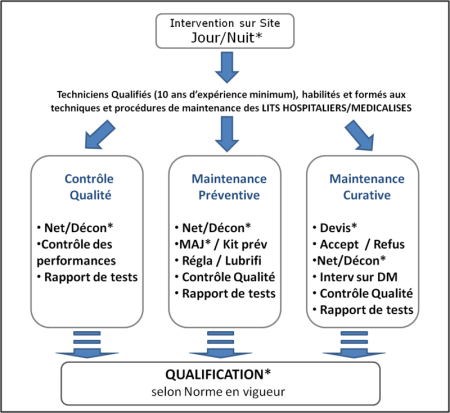 SSTI garantit un contrôle complet du bon fonctionnement de tous les éléments de lit. Cette prestation comprend également tous les contrôles de sécurité électrique (cf.IEC 60-601.1) et l’ensemble des opérations destinées à évaluer le maintien des performances revendiquées par le fabricant (cf. article D 665-5-1 du décret 2001-1154 du 5 décembre 2001) ainsi qu’à vérifier le bon fonctionnement des alarmes et sécurité.